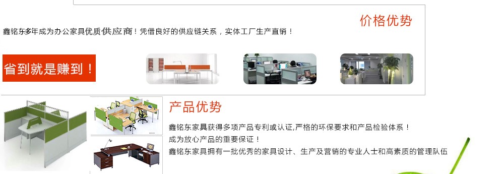 深圳市鑫銘東家具有限公司專業銷售各類辦公家具!產品涉及多種系列,如:班臺、班椅、屏風、會議桌、會議椅、辦公沙發、茶幾、辦公桌、文件柜、電腦桌椅、各式餐臺、餐椅、書柜等辦公家具。 鑫銘東家具擁有一批優秀的家具設計、生產及營銷的專業人士和高素質的管理隊伍。銘東家具以"先難后易"之戰略,在產品結構、產品質量及服務水平方面,均推陳出新,力求完善,精益求精。使我們的產品質量保持在國內外家具潮流的先進水平,力求滿足客戶的特殊需求。鑫銘東家具多年來致力于環保、實用家具的設計與開發,集生產、銷售、服務于一體。本著"以人為本"的設計理念,大量開發符合人體工程學的各種產品,以"誠信為本"的質量方針,真材實料,認認真真做產品,實實在在做人。鑫銘東家具更致力于創造"零維修率"的制造境界,實現"沒有維修的服務才是最好服務"的口號》了解更多